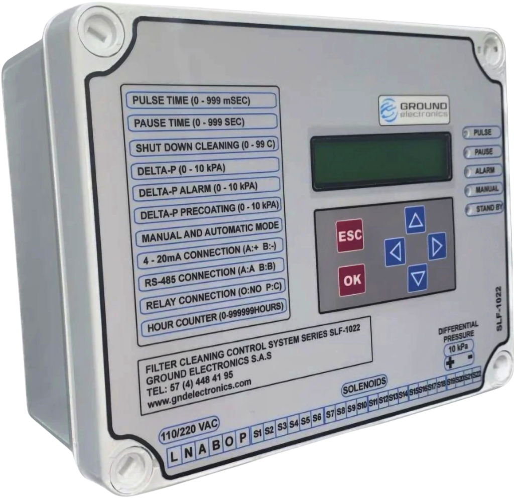 Sistema para control inteligente de limpieza en filtros de mangas y filtros de cartuchos con mecanismo de limpieza «Pulse-Jet» de hasta 22 electroválvulas pensado para controlar filtros de mayor tamaño que no alcanzan a ser controlados por el economizador de 6 Salidas.